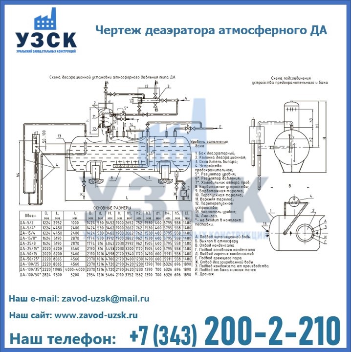 Приобрести качественное оборудование, в том числе, деаэраторы ДА, можно в компании УЗСК в Жаркенте. Мы предлагаем долговечную и надежную продукцию по приемлемой цене. Заказать и купить деаэраторы или другие изделия высокого качества можно через сайт Уральского Завода Стальных Конструкций, или позвонив по указанному в разделе «Контакты» телефону.