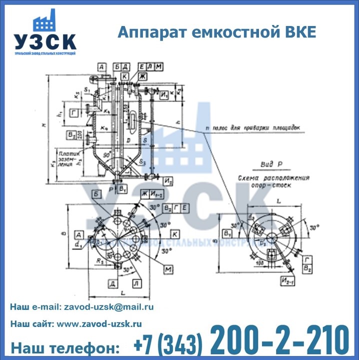 Емкостные аппараты ВКЭ представляют емкость с эллиптической крышей и коническим днищем. аппарат может использоваться в Жаркенте для приема и хранения жидкостей и взрыво- и пожароопасных веществ. Создаваемое давление не должно превышать 0,6; 1,0 МПа. Емкости ВКЭ выполняются как цельносварные. Используется марка стали, отвечающая степени агрессивности продукта и температуре эксплуатации.